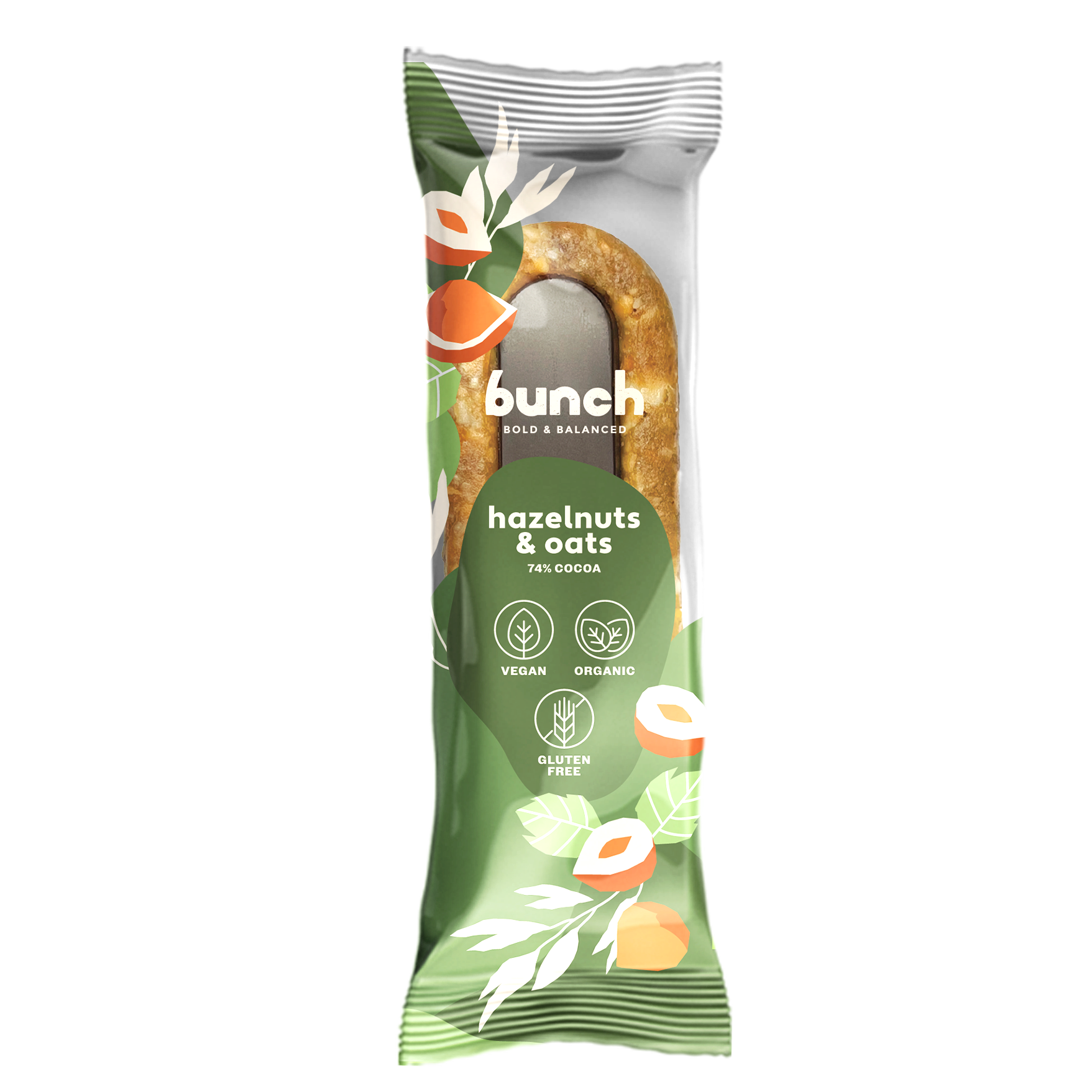 Ces délicieuses barres sont faites de dattes séchées, de noisettes grillées croquantes et de flocons d'avoine sans gluten, le tout agrémenté d'une tablette raffinée de chocolat noir avec pas moins de 74 % de cacao.